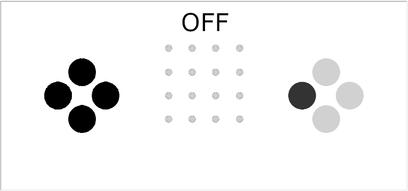 after batteries are inserted, the device is ON. to turn it OFF and ON again, use these button combos: