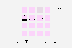 The sequencer's 16 steps are organized as a 4*4 matrix, where notes can be set and removed with one button press. Parameters are set for each note rather than for the whole channel (which is still possible though by changing all notes at once from within the menu) to provide a maximum of flexibility within the limited number of channels. Available parameters include pitch, 4-note chords (2 x arpeggio, 1 x actual polyphonic chords), volume envelope, pitch envelope/LFO, filter/modulation envelope/LFO, shuffle and panning.